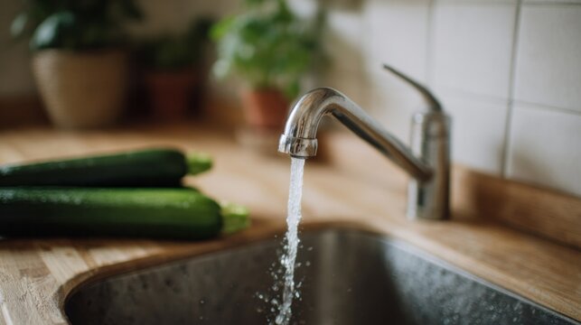 Glistening faucet serenades cucumbers with refreshing splash, renewing kitchen rituals, evoking World Water Day and culinary mindfulness