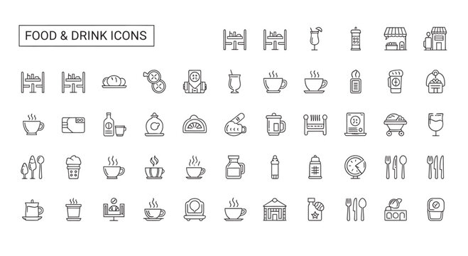 Collection of food and drink symbols arranged on white surface representing culinary and beverage options in a minimalist style.
