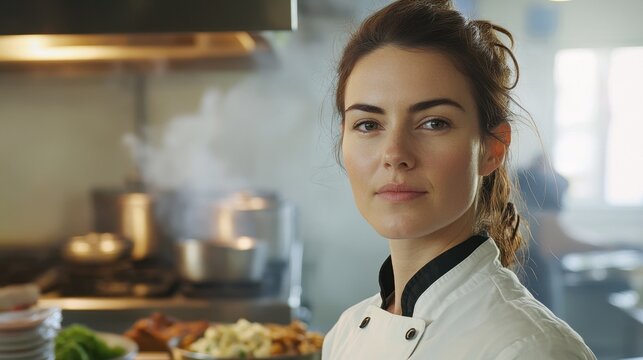 Sensual female chef in a restaurant kitchen, exuding passion and skill with a slight smile. Her culinary creations are a feast for the senses. Generative AI