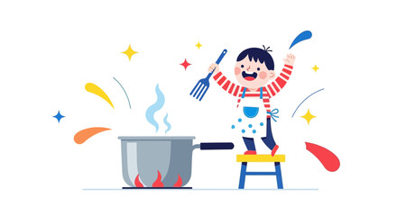 Colorful cooking utensils for kids, playful kitchen tools, vibrant and creative design, minimalistic setup, child-friendly kitchenware, fun culinary play, educational, artistic flat lay