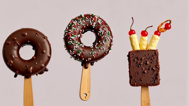 Chocolate-covered donut ice cream treats with festive sprinkles and playful cherry decorations on wooden sticks for a creative dessert experience