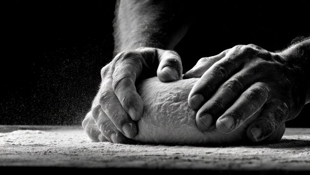 Black and White Image of a Baker Kneading Dough with Dust Particles in the Air Showing Artisan Bread Making Process in a Bakery Kitchen