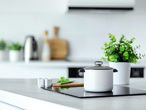 A sleek and modern kitchen with a white cooking pot on the stove, surrounded by minimalistic decor and greenery