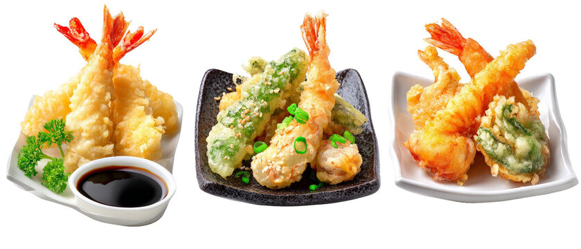 A vibrant display of assorted tempura shrimp, beautifully arranged on elegant plates with a side of dipping sauce, set against a clean, white background, ideal for culinary promotions
