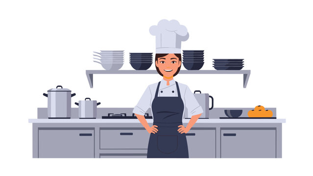 Confident female chef smiling in a clean, modern kitchen ready to create culinary magic, perfect for restaurant promotions and cooking blogs