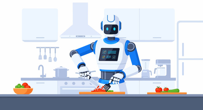 Futuristic Robot Chef Preparing Food in a Modern Kitchen Setting