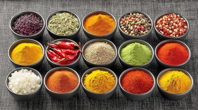 Overhead spice bowl matrix on grey cloth, black-brown-blue accents, ideal for social ad, cooking tutorial cover, phone wallpaper