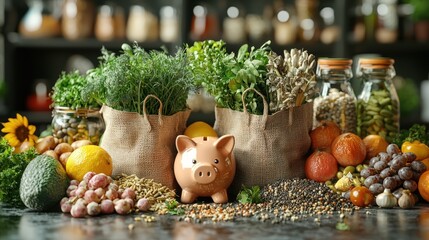 Colorful arrangement of fresh produce and herbs with a piggy bank centerpiece