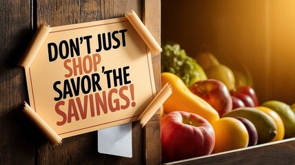 Fresh produce with motivational sign encouraging shopping and savings in grocery market