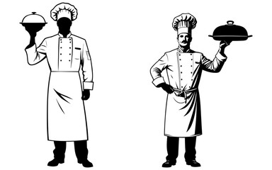Chef standing front silhouette holding cooking pan vector for restaurant branding culinary school marketing and food service promotional materials