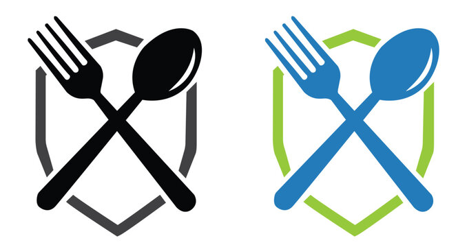 Restaurant food safety logo featuring crossed fork and spoon icons on a protective shield for hygiene certification catering services and culinary branding