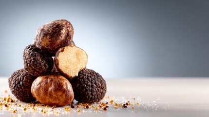 A beautifully arranged stack of exotic truffles, showcasing their unique shapes and earthy textures, creating an artistic expression of luxury and culinary delight.