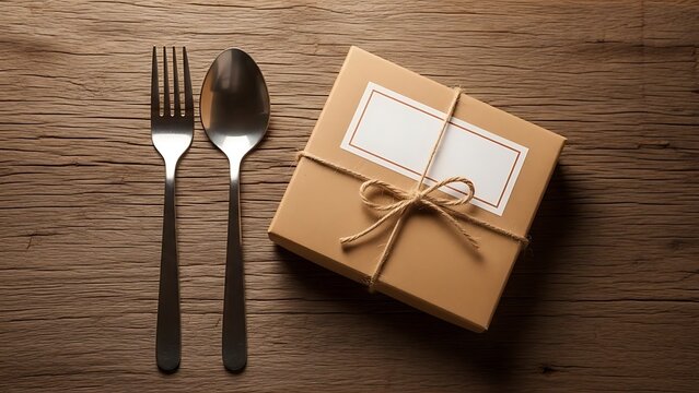 A charming culinary scene featuring a fork, spoon, and a beautifully wrapped gift box on rustic wood