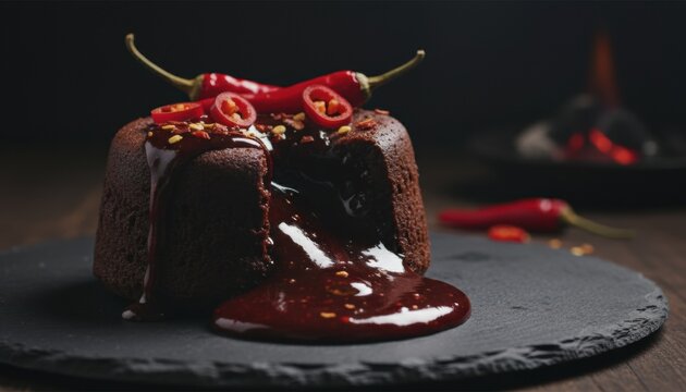 Rich chocolate lava cake topped with chili peppers represents adventurous cuisine trends, fusion desserts, bold flavor exploration, and rising interest in gourmet food innovation