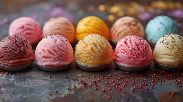 Several ice cream scoops in different flavors are beautifully arranged in a neat line, showcasing a colorful and tempting array of this frozen and delightful dessert.