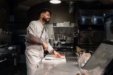 A young male chef preparing food in a restaurant kitchen, displaying culinary expertise and passion for cooking