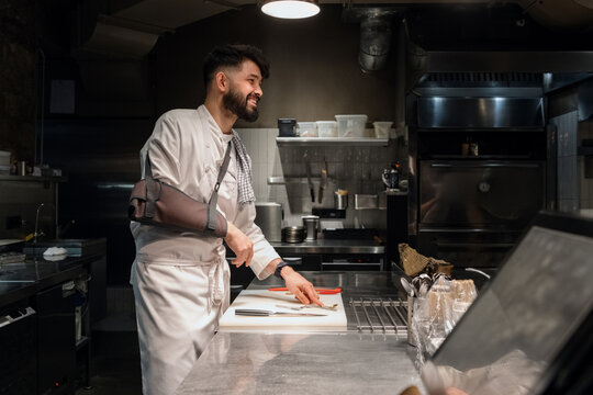 Chef sits at kitchen counter in focus on tasks and emotions. Stainless steel workspace with cooking equipment in background. Concept of culinary industry, restaurant management, food service