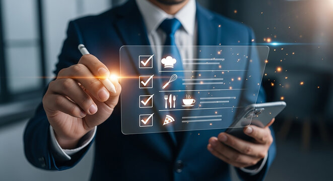 Empowering culinary excellence A chef meticulously reviews a digital menu on a sleek interactive display with vibrant