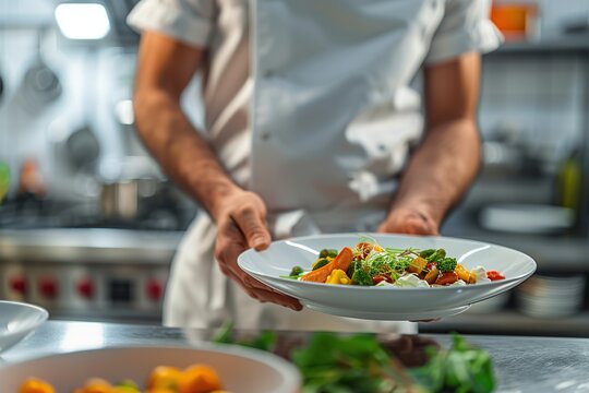 A chef stands in a bustling kitchen, using a tablet to manage food orders as staff work on various dishes, creating a lively and active atmosphere