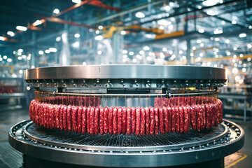 Skilled workers utilize sharp knives to carefully cut and prepare fresh meat in a semi-automated processing area. The environment is regulated for safety and efficiency