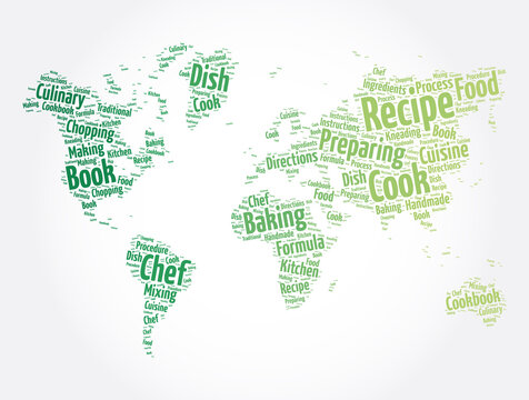 Global Cuisine: A world map with food icons like sushi, tacos, and pasta