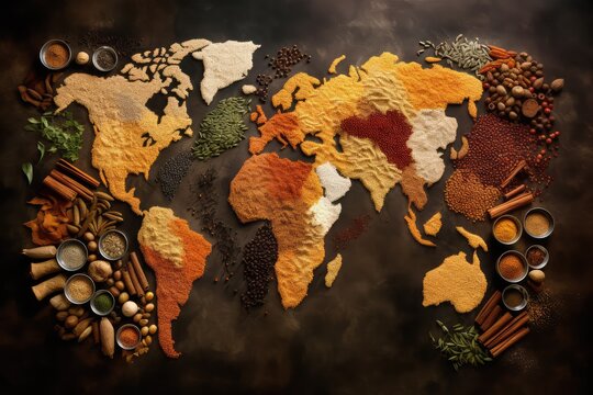 Food from many countries, parts of the world, representing diverse cuisines and cultures. Map world food. Generative AI