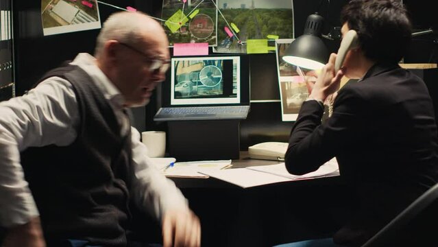 Detectives team rushing to catch culprit after receiving call with suspects whereabouts, landline phone. Police experts finding about illegal operation location, solving case. Handheld shot.