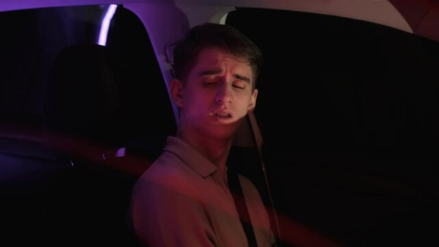 Drunk sleepy culprit of traffic accident yawning in car after accident