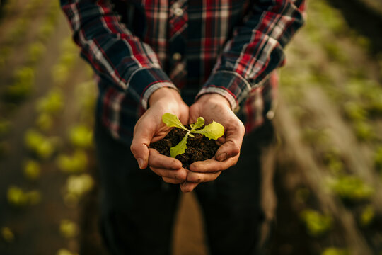 Farmer hand holding young plant. Top view. Banner. New life, eco, sustainable living, zero waste, plastic free, earth day, investment concept. Gospel spreading. Nurturing baby plant, protect nature