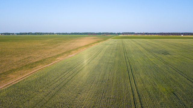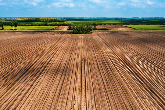 Aerial shot of cultivated agricultural field, drone pov
