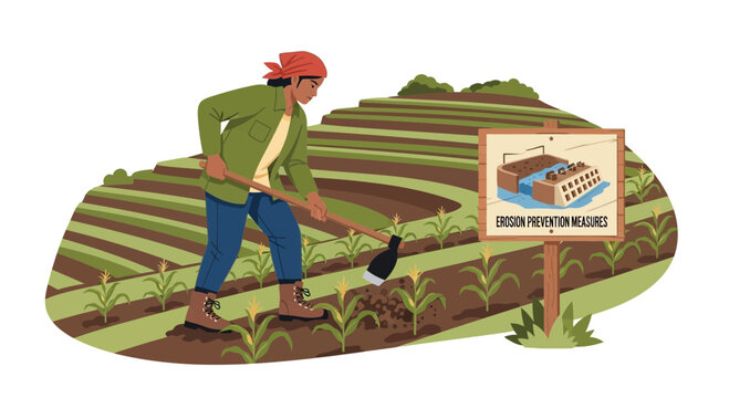 Hardworking farmer cultivating terrace fields with erosion prevention illustration