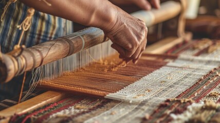 Close up detail of hands weaving traditional Georgian textile on loom. Artisan skill creating patterned fabric. Handicraft and cultural heritage concept