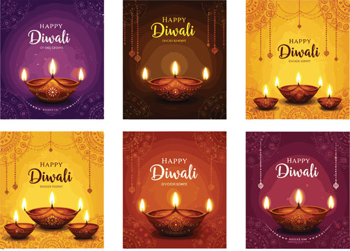 Happy Diwali festival celebration with colorful rangoli design, glowing traditional oil lamps, bright festive background, cultural decoration, Hindu festival of lights illustration