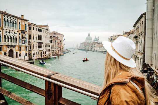 A stylish woman gazes upon the bustling cityscape and tranquil river, adorned in a fashionable hat and clothing, as a ship and gondola glide by on the water