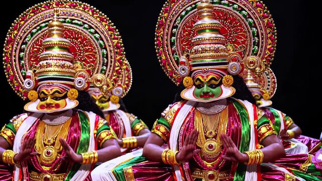 Kathakali dancers in vibrant costumes and elaborate makeup performing traditional indian dance with expressive hand gestures against black backdrop, embodying cultural artistic heritage