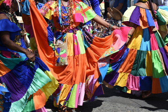 Colorful festive celebration with Latin American flags and intricate decorations strung together. Bright, vibrant, vivid colors in background suggest cultural traditions, diversity, and community joy.