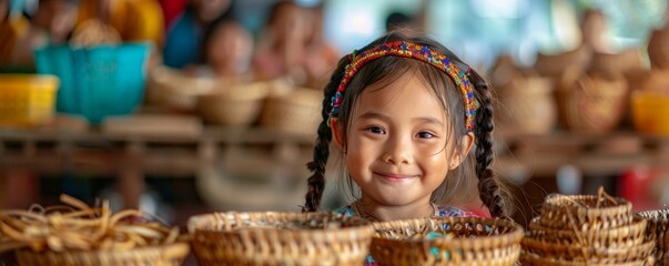 Asian descent children at AAPI craft workshop, crafting traditional items in classroom with wall copy space