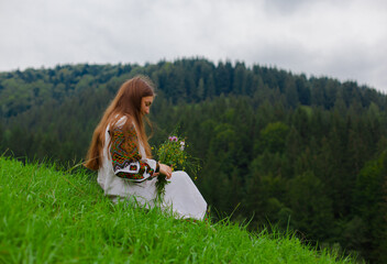 girl in embroidery with a bouquet of wild flowers sits on green grass in the carpathian mountains
