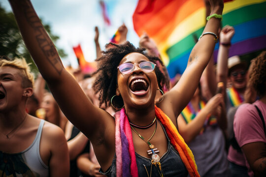 Joyful celebration of diversity at a pride event: Diverse group of people from various cultural backgrounds celebrating together in a vibrant, inclusive atmosphere
