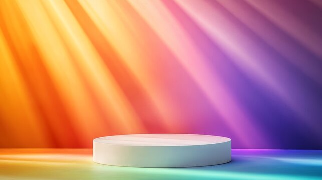 White podium on rainbow flag background with spotlight for product display, celebrating pride month
