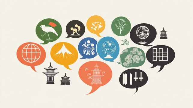 An evocative portrayal of cultural dialogue with a series of interconnected speech bubbles filled with traditional symbols from various cultures, symbolizing respectful communication
