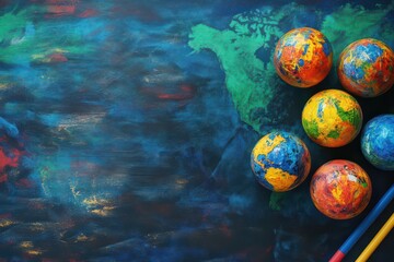 Celebration of world day of cultural diversity with colorful globes on artistic map for global unity. Horizontal banner. Copy space. World Population Day