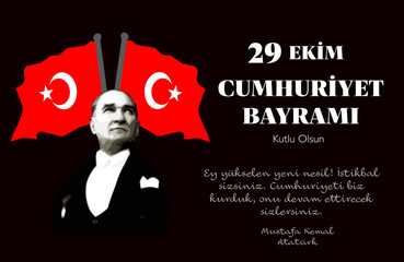 29 October Republic Day in Turkey. Translation: 29 October Republic Day Turkey and the National Day in Turkey. (Turkish: 29 Ekim Cumhuriyet Bayrami Kutlu Olsun.) Poster, Social Media, Greeting card.