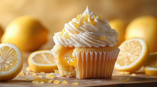 Sliced cupcake reveals lemon filling on a cutting board with lemons in the background