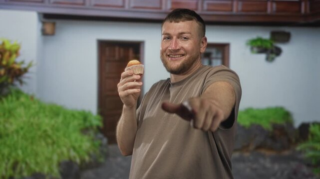 Man smiling, holding muffin with both hands and points finger to camera at a building entrance outdoors; playful welcome.