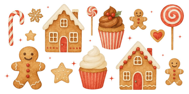 Christmas watercolor illustration set with gingerbread houses, cookies, cupcakes, candy canes, lollipops, caramel sweets, festive holiday elements, isolated on white background, perfect for packaging,
