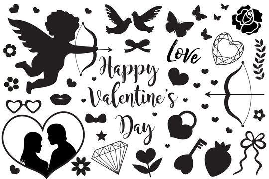 Happy Valentine's Day set of icons stencil black silhouette. Cute romance love collection of design elements with cupid, heart, couple, pigeons, diamond, butterfly, flowers. Vector illustration