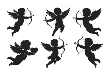 Set of silhouette cupid. Collection of cupid shoots a bow with hearts. Love symbol. Vector illustration for Valentine's Day. Romantic angel. Tattoo.