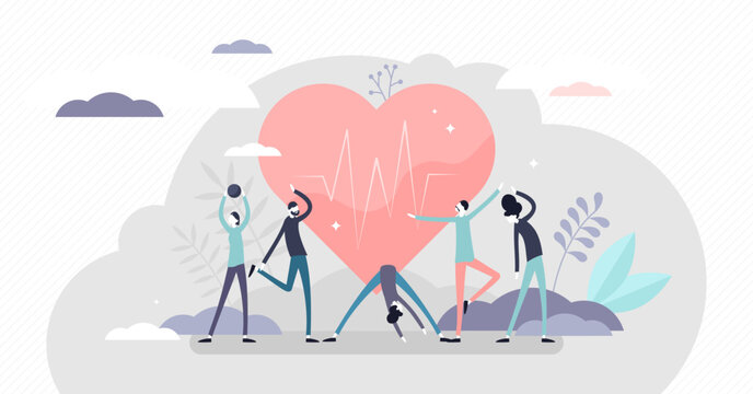 Good health concept, flat tiny persons illustration, transparent background. Active lifestyle with exercise workouts and healthy diet. Abstract heartbeat wellness symbol.