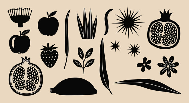 A curated collection of black silhouette icons featuring fruits, flowers, and leaves for modern graphic design projects